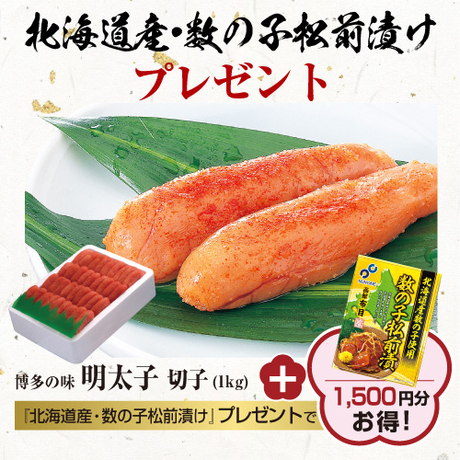 《豪華プレゼント付キャンペーン》『博多の味 明太子 切子(1kg)』 お買い上げ毎にもれなく『数の子松前漬け』(1,500円相当)プレゼント! 2026年1月31日まで寿ポイントも最大5%貯まります♪