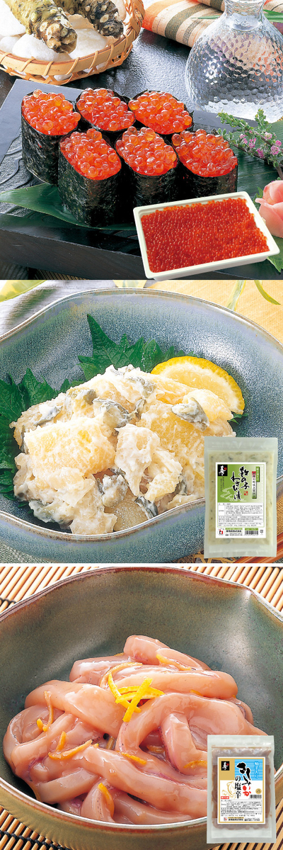 ●化粧箱入/335×225×60㎜ ●内容量:北海道産醤油いくら500g ●柚子入り いかの塩辛 230g ●数の子わさび漬け 290g ●包 装:箱入