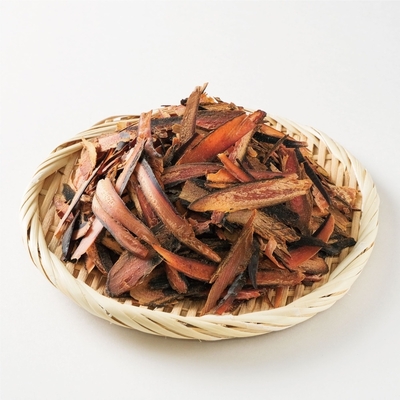 通常の鰹節(本枯節など)に比べ、血合いが多いため、非常に濃厚で強いコクと独特の香りを持つ「宗田節」を使用。じっくり煮出すことで香りが飛びにくく、澄んだ黄金色のだしが取れる「厚削り」に加工しました。