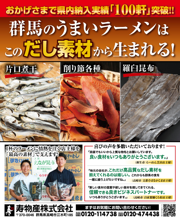 群馬県・栃木南部(佐野・足利)・埼玉北部(本庄、深谷)のラーメン店も含め165軒のラーメン店が紹介されている『群馬のうまいラーメン2025‐2026【最新号】に、寿物産㈱の業務用だし素材で協賛いたしました。