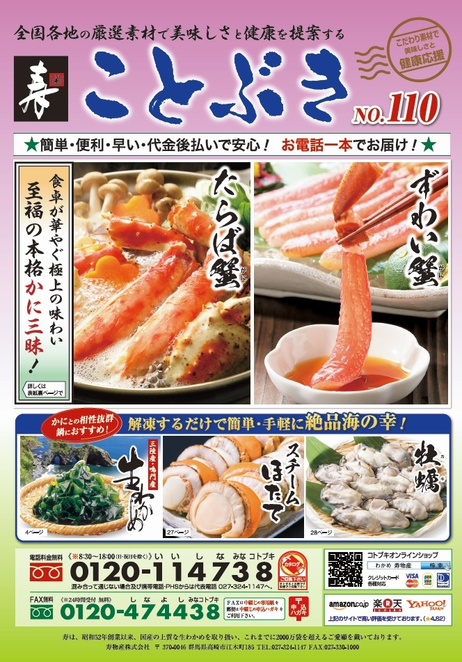 ご自宅用はもちろんのこと、年末年始のご贈答に美味しい海産物「生ズワイカニ」・「タラバカニ」や「北海道産いくら」をはじめ、大粒な身と濃厚な出し汁!「青森県大河原湖産 大和しじみ」・特別栽培米「コシヒカリ」などの新商品を多数ご紹介!