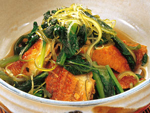 ![]() だし汁を火にかけ、みりん・醤油を入れて、小松菜とうなぎを入れ、温まる程煮てから、くき糸ワカメを加えた後さっと煮て出来上がり。 |